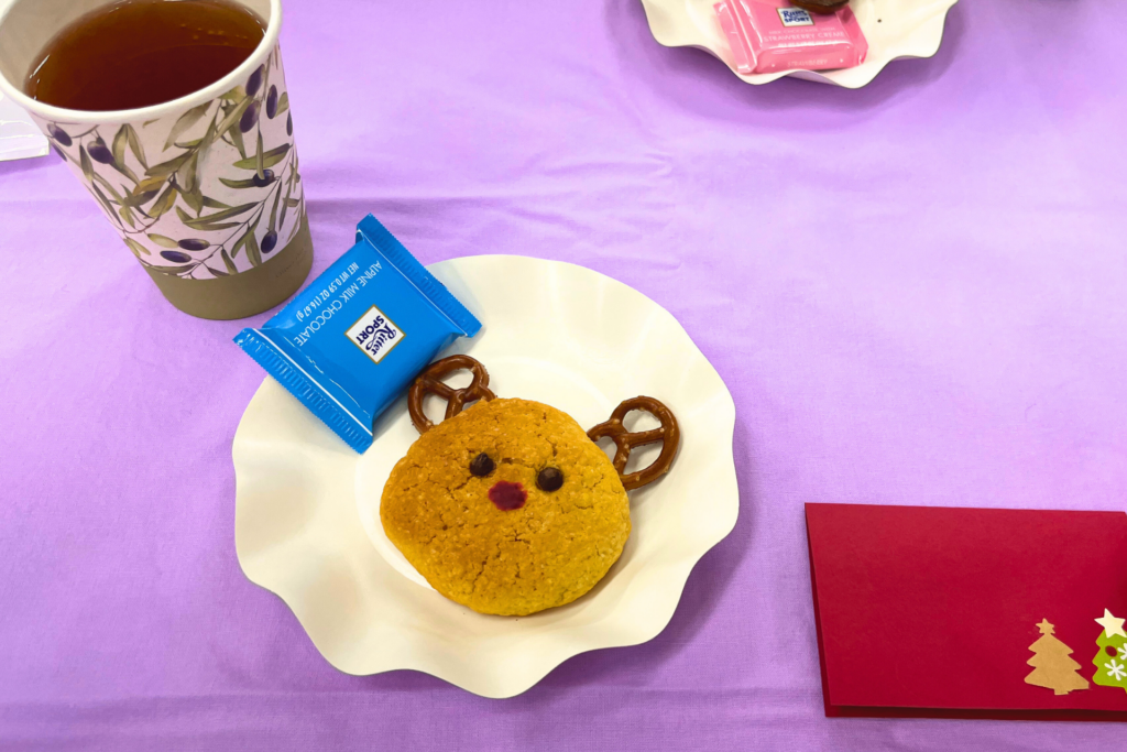 手と頭を動かした後は、教会メンバーが作ってくれた可愛いトナカイクッキーと甘いチョコでちょこっとした